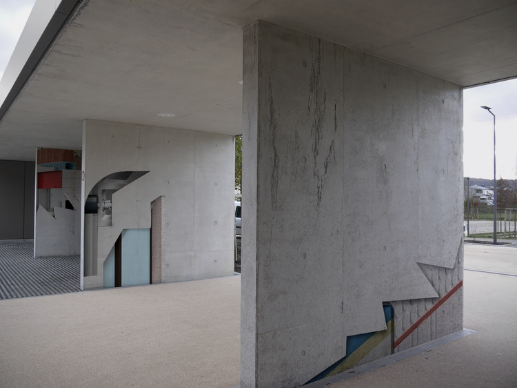 The project and its execution reference the “trompe-l’œil” technique (Scheinmalerei), a pictorial method that creates optical illusions, making objects or spaces appear three-dimensional on a flat surface. Here, trompe-l’œil dissolves the rigidity of the concrete canopy walls, integrating with the architecture while pushing the limits of representation. From antiquity (Pompeii frescoes) to contemporary practices, this technique has maintained a strong connection to architecture.